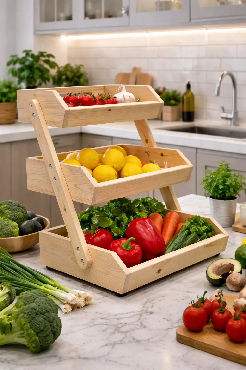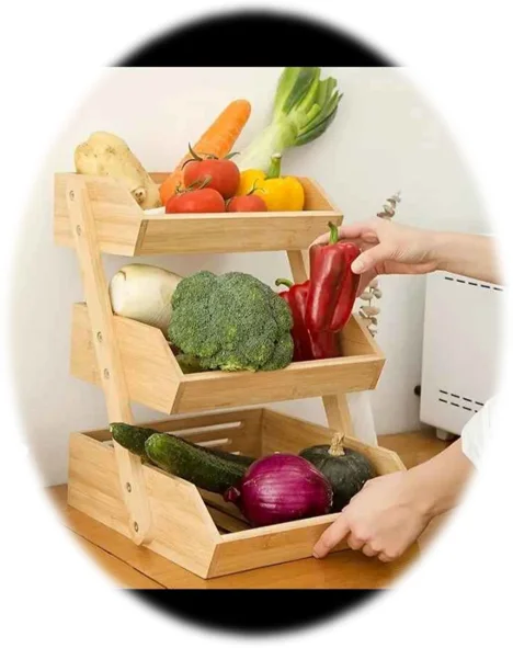 مصنوع بجودة عالية واش كتكرهي فوضى الخضر فالمطبخ؟الخضر منظم خشبي من Golden Nature كيعطيك أناقة تنظيم فآنٍ واحد مصنوع من خشب Boiruje الطبيعي، بثلاثة مستويات مخصص للفواكه والخضر.
